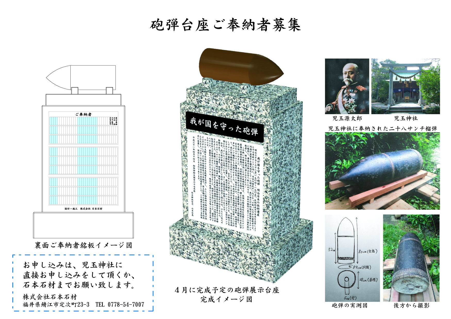 弊社(株)石本石材が設計施工を致しました『児玉神社 我が国を守った砲弾(明治日本の技術遺産 二十八センチ榴弾砲の砲弾)』を展示するにあたり、御奉納者三百名(今日現在二百名)募集のお知らせです。
